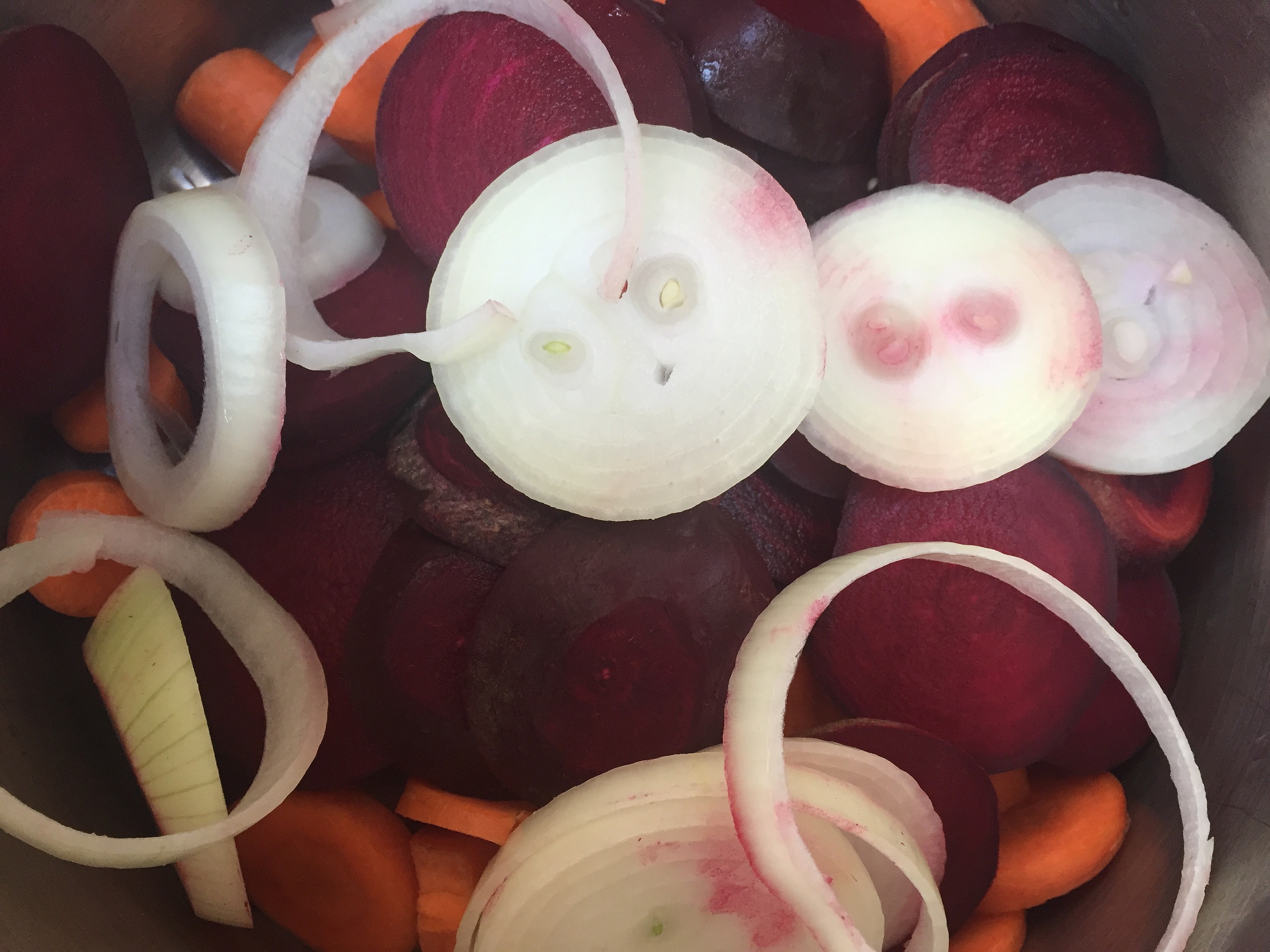 - Slice beets, carrots and onions into rings, put them in a big pot, cover with water, add salt, pepper, bay leaf, and let simmer for 30 minutes or while you prep the fish. (HEALTHY NOTE: Buy beets and carrots with tops – fresh tops tell you that the vegetable was recently picked and retained more of its vitamin content. Carrot tops must be discarded, but beet tops are delicious in smoothies. Blend it with some organic Kefir for one leafy greens + probiotics booster).